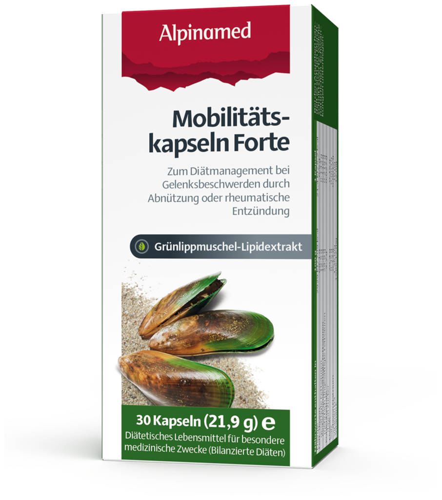 Alpinamed® Mobilitätskapseln Forte enthalten 150 mg Grünlippmuschel-Lipidextrakt (Perna canaliculus), gelöst in 350 mg Fischöl.