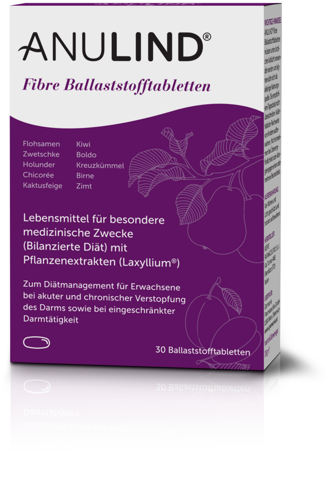 ANULIND® Fibre Ballaststofftabletten, basierend auf einem Komplex aus 10 hochwertigen Zutaten aus Obst und Gemüse (Laxyllium®), wurden speziell entwickelt um Ihr Verdauungssystem zu fördern und das Wohlbefinden Ihres Darmtrakts zu unterstützen. ANULIND® gleicht den Ballaststoffmangel bei akuten und chronischen Verstopfungen des Darms sowie bei eingeschränkter Darmtätigkeit aus.