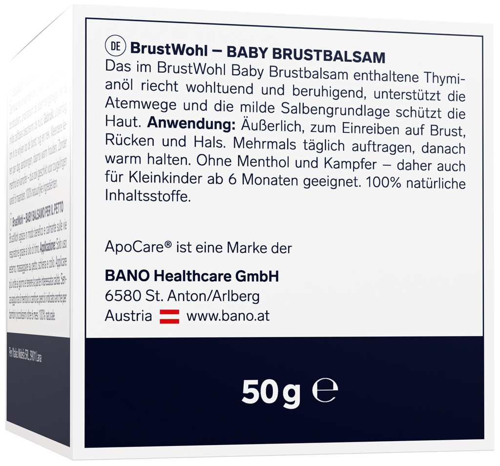 Mit dem ApoCare BrustWohl Baby Brustbalsam kümmern wir uns um das Wohl der ganz Kleinen. Das darin enthaltene Thymianöl riecht nicht nur wohltuend und beruhigend, sondern unterstützt auch die Atemwege. Dabei schützt die milde Salbengrundlage die empfindliche Haut eines Kleinkindes.