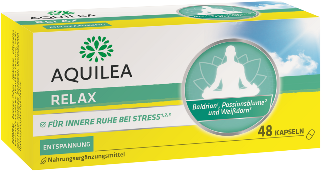 Aquilea Relax unterstützt die Entspannung durch die enthaltene Pflanzenkombination mit Baldrian, Passionsblume und Weißdorn. Baldrian ist die ideale Pflanze in Belastungssituationen, da sie entspannende Effekte auf das Nervensystem hat. Die Passionsblume ist eine Pflanze, die besonders häufig während Belastungsphasen zur Unterstützung der mentalen Gesundheit eingesetzt wird. Weißdorn ist hilfreich zur Unterstützung in stressigen Situationen und zur Beruhigung im hektischen Alltag.