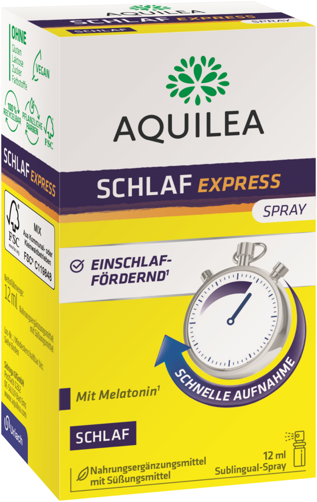Es gibt Situationen im Leben, in denen unser Schlaf beeinträchtigt ist und wir uns deshalb nicht ausreichend erholen können. Dies mindert unsere Leistungsfähigkeit während des Tages. Auch unsere Stimmung und unsere Kraftreserven können darunter leiden. Aquilea Schlaf Express ist ein innovatives Sublingualspray mit Melatonin. Melatonin trägt mit 1 mg zur Verkürzung der Einschlafzeit und mit mind. 0,5 mg zur Linderung der subjektiven Jet-Lag Empfindung bei.