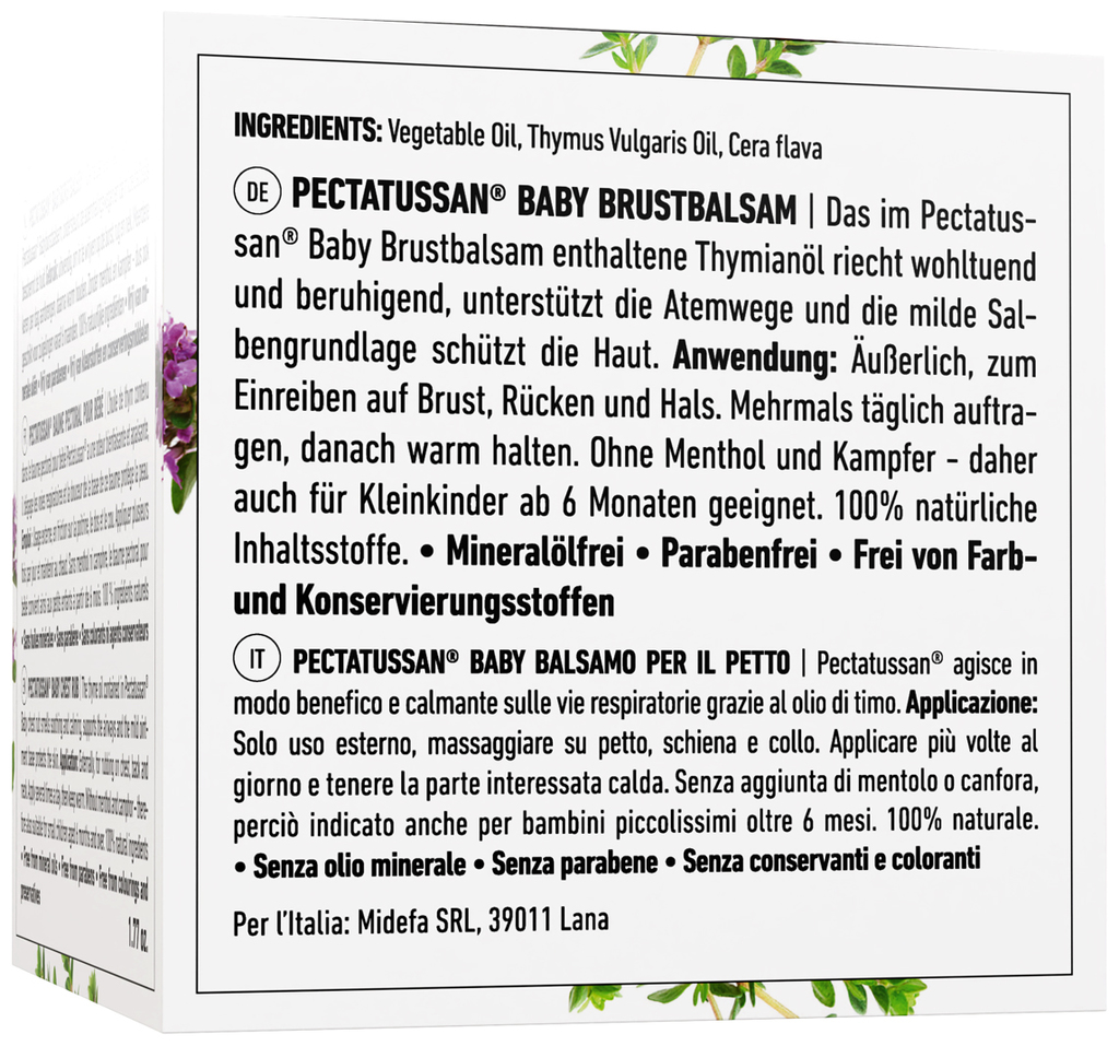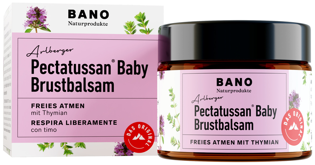 Mit 100% natürlichen Inhaltsstoffen ist der Arlberger Pectatussan Baby Brustbalsam ganz ohne Menthol und frei von Mineralölen und Parabenen.