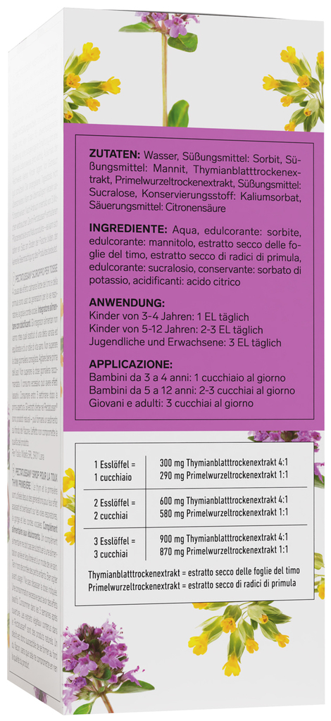 1 Esslöffel enthält 300mg Thymianblatttrockenextrakt 4:1, 290mg Primelwurzeltrockenextrakt 1:1