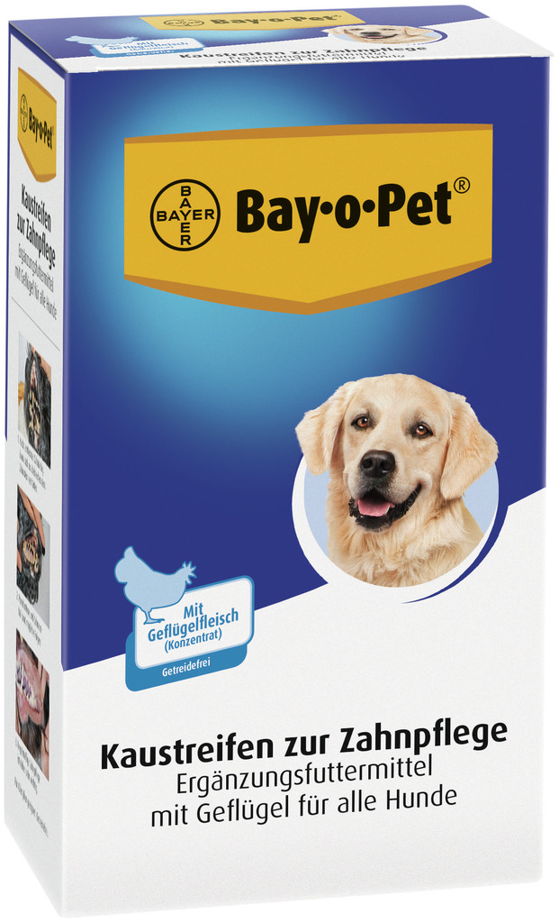 Nicht entfernter Zahnbelag kann sich zu übel riechendem Zahnstein verhärten. Parodontose und Zahnausfall sind mögliche Folgen. Regelmäßige Zahnpflege ist daher sehr wichtig. Bay-o-Pet® Kaustreifen leisten einen sinnvollen Beitrag zur täglichen Ernährung und zur Steigerung des Wohlbefindens des Hundes. Durch Bay-o-Pet® Kaustreifen werden nicht nur Zähne und Zahn-fleisch mechanisch gereinigt, sondern auch die Kaumuskulatur und das Gebiss des Hundes gestärkt. Darüber hinaus werden während des Kauens natürliche Enzyme freigesetzt, die die Zähne von gefährlichen Zahnbelägen befreien und so vor Karies und Parodontose schützen. Bay-o-Pet® Kaustreifen bestehen aus hochwertiger Rinderhaut und werden vom Hund vollständig gefressen. Die Kaustreifen sind somit ein kalorienarmer Belohnungs-Snack für Ihren Hund, der nicht belastet.