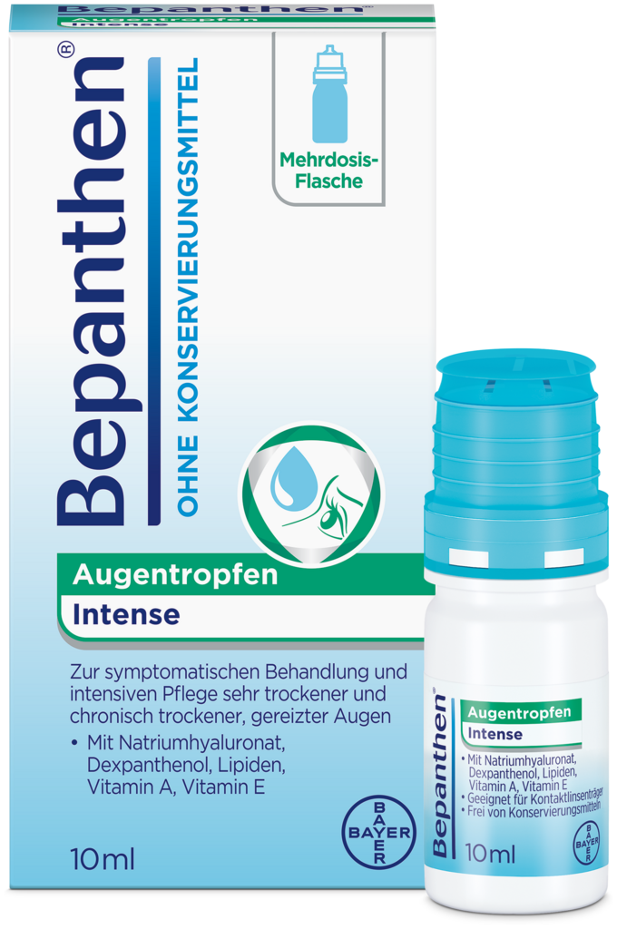 Zudem macht der viskoelastische, klare Schutzfilm die Augenoberfläche gleitfähig und schützt die Hornhaut, ohne die Sehleistung zu beeinträchtigen. Mit Bepanthen® Augentropfen Intense wird der Tränenfilm stabiler und das Auge ist länger befeuchtet. Daher bieten sie eine langanhaltende Linderung, Befeuchtung und intensive Hilfe bei sehr trockenen und chronisch trockenen, gereizten Augen. Auch bei längerfristiger Anwendung und für Kontaktlinsenträger sind die neuen Bepanthen® Augentropfen Intense gut geeignet. Sie kommen außerdem ganz ohne Konservierungsstoffe und Phosphatpuffer aus und sind daher besonders gut verträglich.