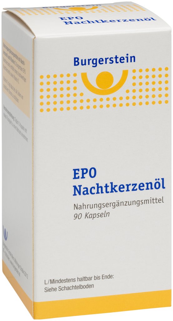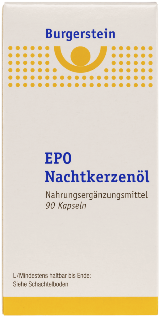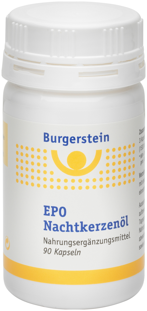 Burgerstein EPO Nachtkerzenöl enthält reines, hochwertiges Nachtkerzenöl sowie Vitamin E. Die im Nachtkerzenöl enthal- tenen Fettsäuren sind wichtige Substanzen, die der Körper nicht selber herstellen kann. Nachtkerzenöl kann dazu beitragen, trockene Haut geschmeidig zu machen und unterstützt bei der Regulierung von erhöhten Blutfett-Werten