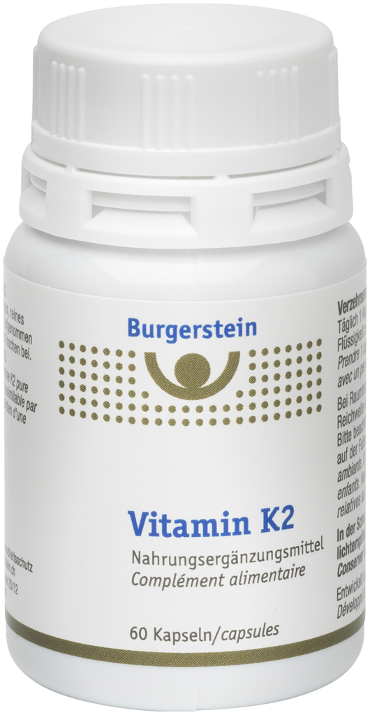 Burgerstein Vitamin K2 Kapseln enthalten hochwertiges, reines Vitamin K2, das besonders gut vom Körper aufgenommen wird (all-trans Menachinon-7). Vitamin K trägt zur Erhaltung normaler Knochen bei.