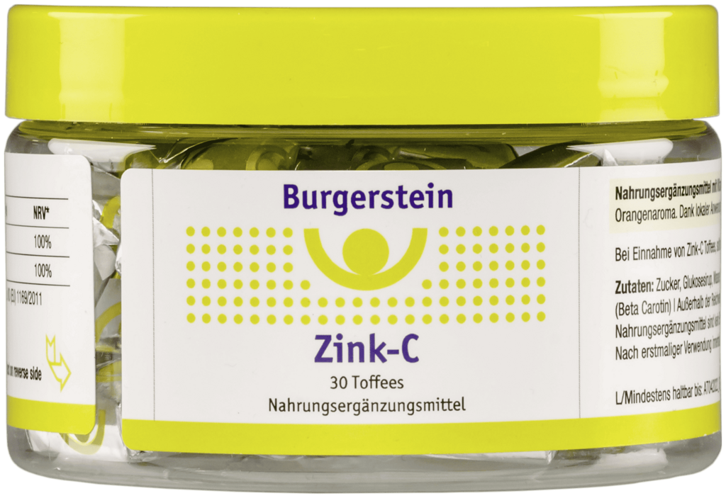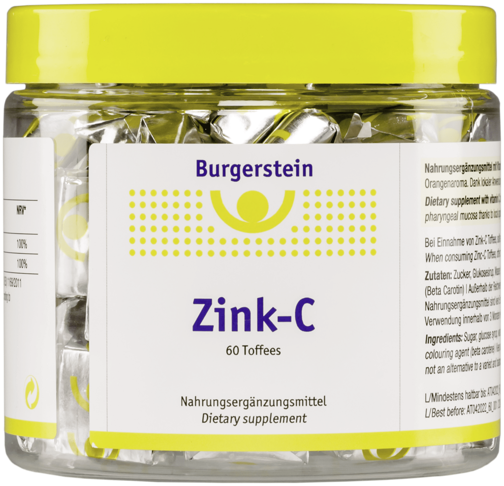 Burgerstein Zink-C sind schmackhafte Toffees zum Lutschen mit Zink, Vitamin C und feinem Orangenaroma. Über die Schleimhäute können Zink und Vitamin C bestens aufgenommen werden. Beide Mikronährstoffe unterstützen die normale Funktion des Immunsystems.