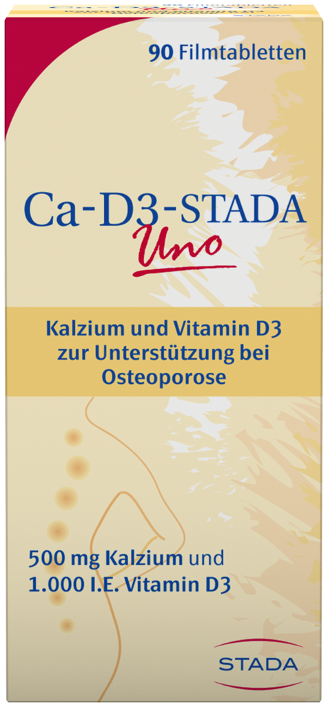 Ca-D3-STADA Uno ist ein Nahrungsergänzungsmittel mit 500 mg Kalzium und 1.000 I.E. Vitamin D3 - speziell für Frauen ab 50 bei postmenopausal bedingtem Mangel der Knochenmineraldichte.