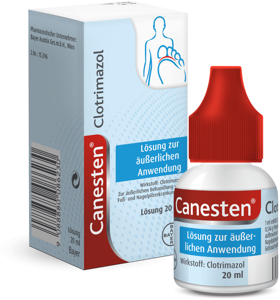 Canesten Clotrimazol - Lösung ist ein Arzneimittel zur Behandlung von Pilzerkrankungen (Mykosen) der Haut. Aufgrund des breiten Wirkspektrums von Clotrimazol wirkt die Lösung gegen viele verschiedene Erreger, die beim Menschen Pilzinfektionen der Haut hervorrufen können. Durch die lokale Anwendung werden die bei Fuß- und Nagelpilzerkrankungen vorkommenden Pilzarten in ihrem Wachstum gehemmt bzw. abgetötet. Die Lösung wirkt nicht nur auf der Hautoberfläche, sie dringt auch in die tieferen Schichten der Haut ein.