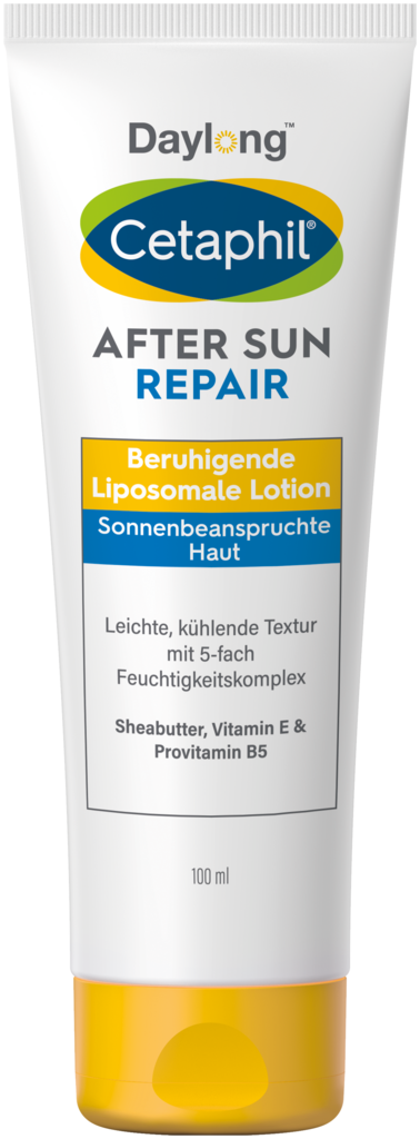 Eine kühlende After-Sun-Pflege kann die sonnengestresste Haut beruhigen und unterstützen. Cetaphil® Sun Daylong™ After Sun Repair Liposomale Lotion ist besonders hautverträglich und sorgt nach dem Auftragen für ein angenehme beruhigtes Hautgefühl. Vitamin E, Dexpanthenol und Glycerin beruhigen die Haut und geben benötigte Feuchtigkeit zurück. Das DNA-Reparaturenzym Endonuklease unterstützt zusätzlich die Regeneration der sonnengestressten Haut. So werden die sonnengestresste Haut beruhigt und körpereigene Reparaturmechanismen unterstützt.