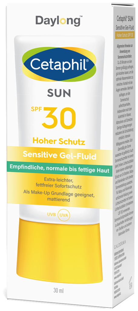 Cetaphil® Sun Daylong™ Sensitive Gel-Fluid Gesicht SPF 30 ist besonders geeignet für zu Sonnenallergie neigende sowie fettige Haut. Die besonders leichte, fettfreie Gel-Formulierung lässt sich gut verteilen, zieht schnell ein und klebt nicht. Vitamin E wirkt antioxidativ. Photostabile UV-Filter bieten hochwirksamen und sofortigen UVA- und UVB-Schutz, effektiven Zellschutz1 und beugen sonnenbedingter Hautalterung vor1. Das Face Gel-Fluid SPF 30 bietet ein angenehmes, mattierendes Hautgefühl und ist sehr gut für den täglichen Sonnenschutz im Gesicht und als Make-up-Grundlage geeignet.