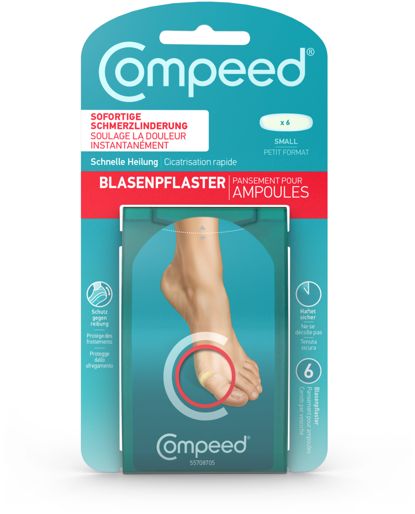 Bei Blasen an der Außenseite des Fußes oder an der Ferse kommt das Compeed® Blasenpflaster Small zum Einsatz. Es bietet effektive Polsterung, lindert den Schmerz sofort und verrutscht nicht. Auch an schwer zu erreichenden Stellen am Fuß, die mit herkömmlichen Pflaster kaum abdeckbar sind, haftet das kleine Blasenpflaster tagelang sicher. Somit eignet es sich perfekt für die Behandlung kleinerer Blasen am Fuß.