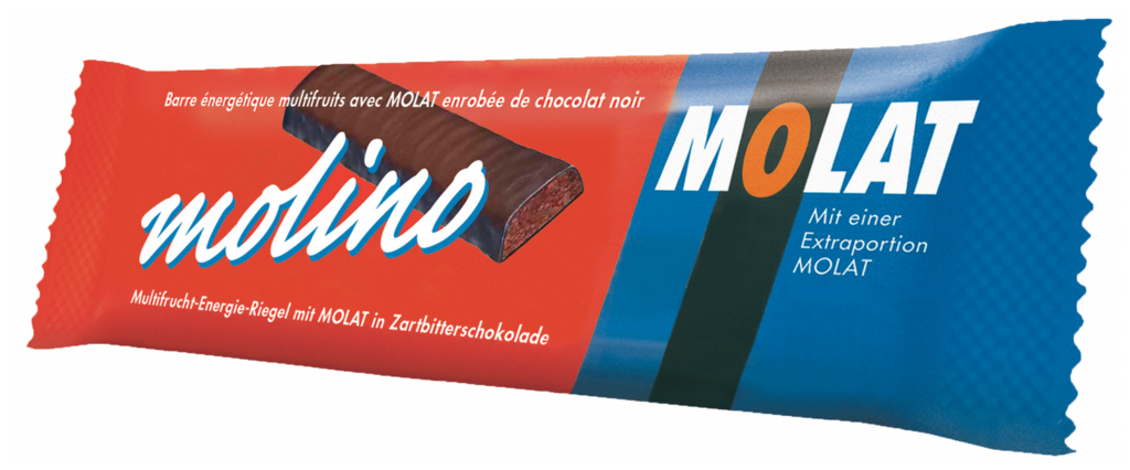 Energie-Riegel mit MOLAT in Zartbitterschokolade und 27 % Fruchtanteil aus 20 Früchten.