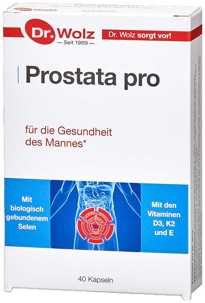 Prostata pro wurde speziell für die Gesundheit des Mannes entwickelt. Prostata pro Dr. Wolz stellt eine wissenschaftlich begründete Zusammenstellung von Mikronährstoffen und sekundären Pflanzenstoffen dar. Sowohl die Einzelsubstanzen, als auch ihre Zusammenwirkung und die aus Studien abgeleiteten Dosierungen sind ernährungsphysiologisch sinnvoll.