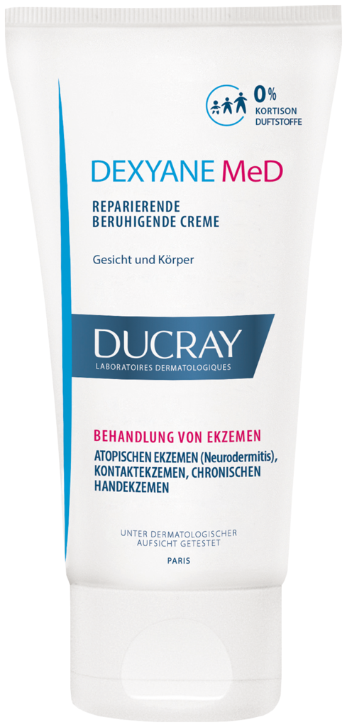 Zur effektiven Behandlung von milden bis moderaten Ekzemen (Neurodermitis, Kontaktekzeme und chronische Handekzeme) wurde von den Laboratoires DUCRAY das Medizinprodukt DEXYANE MeD entwickelt. Ganz ohne Kortison, lindert es den Juckreiz, spendet intensiv Feuchtigkeit und repariert die geschädigte Haut. Zudem legt es einen Schutzfilm auf Ihre Haut, der die Häufigkeit des Wiederauftretens reduziert. Als Medizinprodukt kann DEXYANE MeD sogar in der Akutphase direkt auf offene, schmerzende Hautstellen aufgetragen werden. Sehr gute internationale klinische Studien-Ergebnisse und eine nachweislich sehr hohe Verträglichkeit machen DEXYANE MeD zur sicheren Wahl in der Behandlung von Ekzemen.