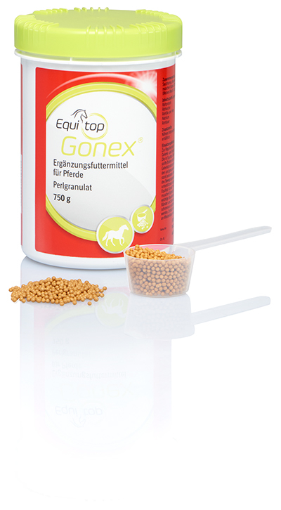 Equitop Gonex® ist ein Perlgranulat zur Regulierung und Stabilisierung des Gelenk- und Bindegewebsstoffwechsels. Gelenke, Knorpel, Bänder und Sehnen sind tragende Elemente des Bewegungsapparats eines jeden Pferdes. Und sie werden jeden Tag stark beansprucht. Mit dem Ergänzungsfuttermittel Equitop Gonex® kann man sie stabilisieren und stärken und somit Verschleiß aktiv vorbeugen.