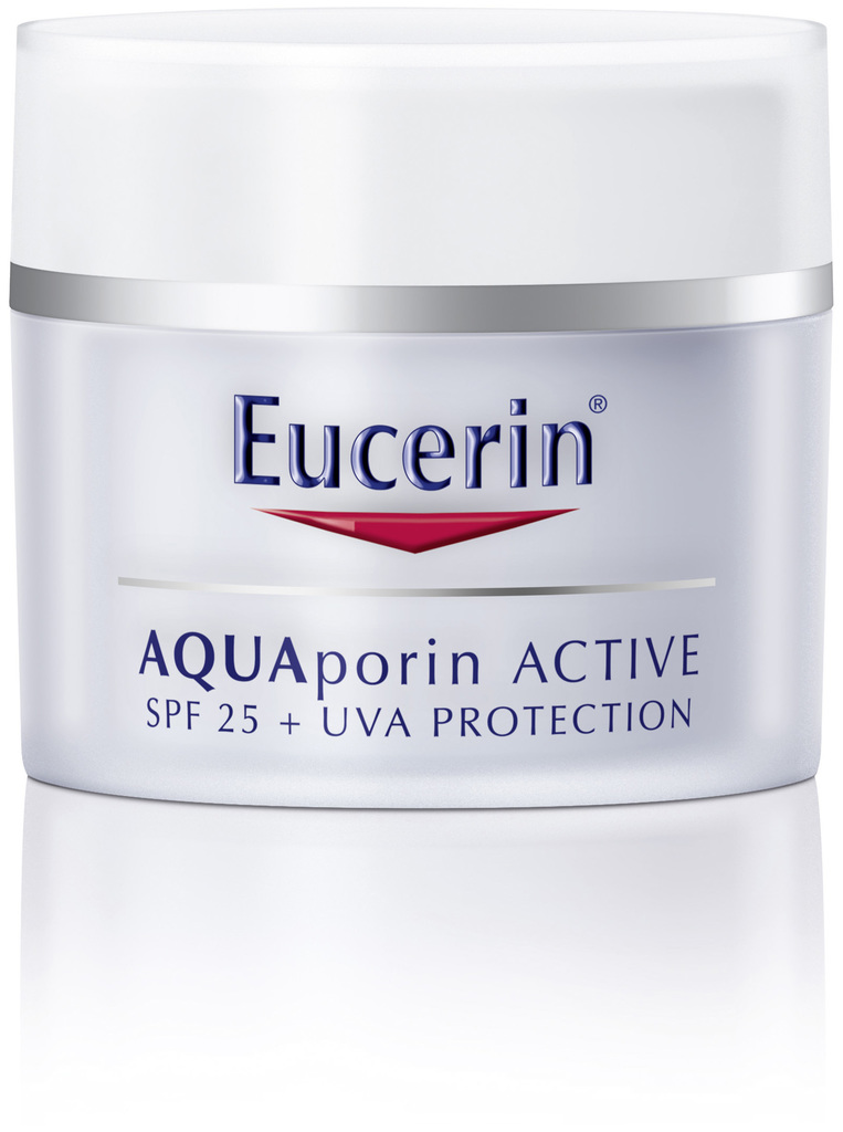 Die erfrischende Feuchtigkeitspflege Eucerin AquaPorin Active mit LSF 25 versorgt empfindliche Gesichtshaut intensiv und langanhaltend mit Feuchtigkeit und schützt sie vor gefährlicher UVA- und UVB-Strahlung.