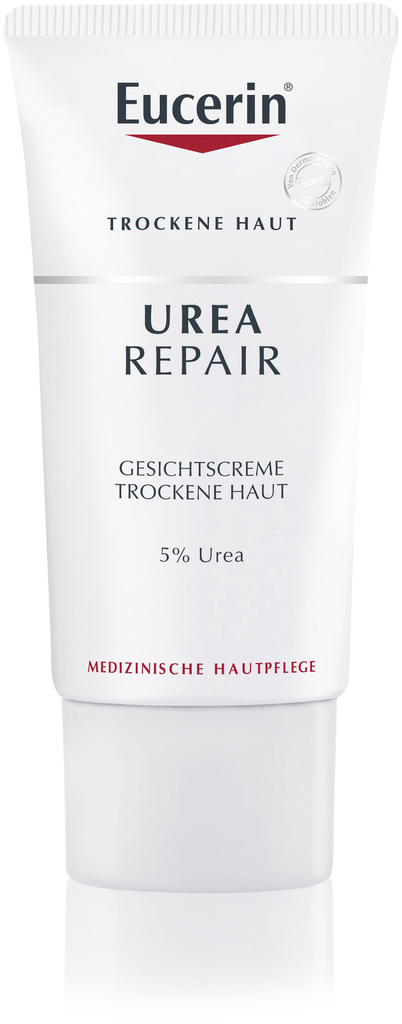 Eucerin UreaRepair Gesichtscreme 5% ist eine schnell einziehende Feuchtigkeitspflege für jeden Tag bei trockener bis sehr trockener, zu Schuppung und Spannungsgefühl neigender Haut. Angereichert mit Urea und Lactat, zwei natürlichen, feuchtigkeitsbindenden Präparaten versorgt die Creme trockene Gesichtshaut sofort mit Feuchtigkeit. Das lindert das Spannungsgefühl und macht die Haut spürbar glatter und geschmeidiger. Eucerin UreaRepair Gesichtscreme 5% bewahrt die Hautfeuchtigkeit und raue Haut wird glatter. Sie ist ideal als Make-up-Grundlage oder nach dem Rasieren geeignet. Auch bei Psoriasis und Altershaut geeignet.