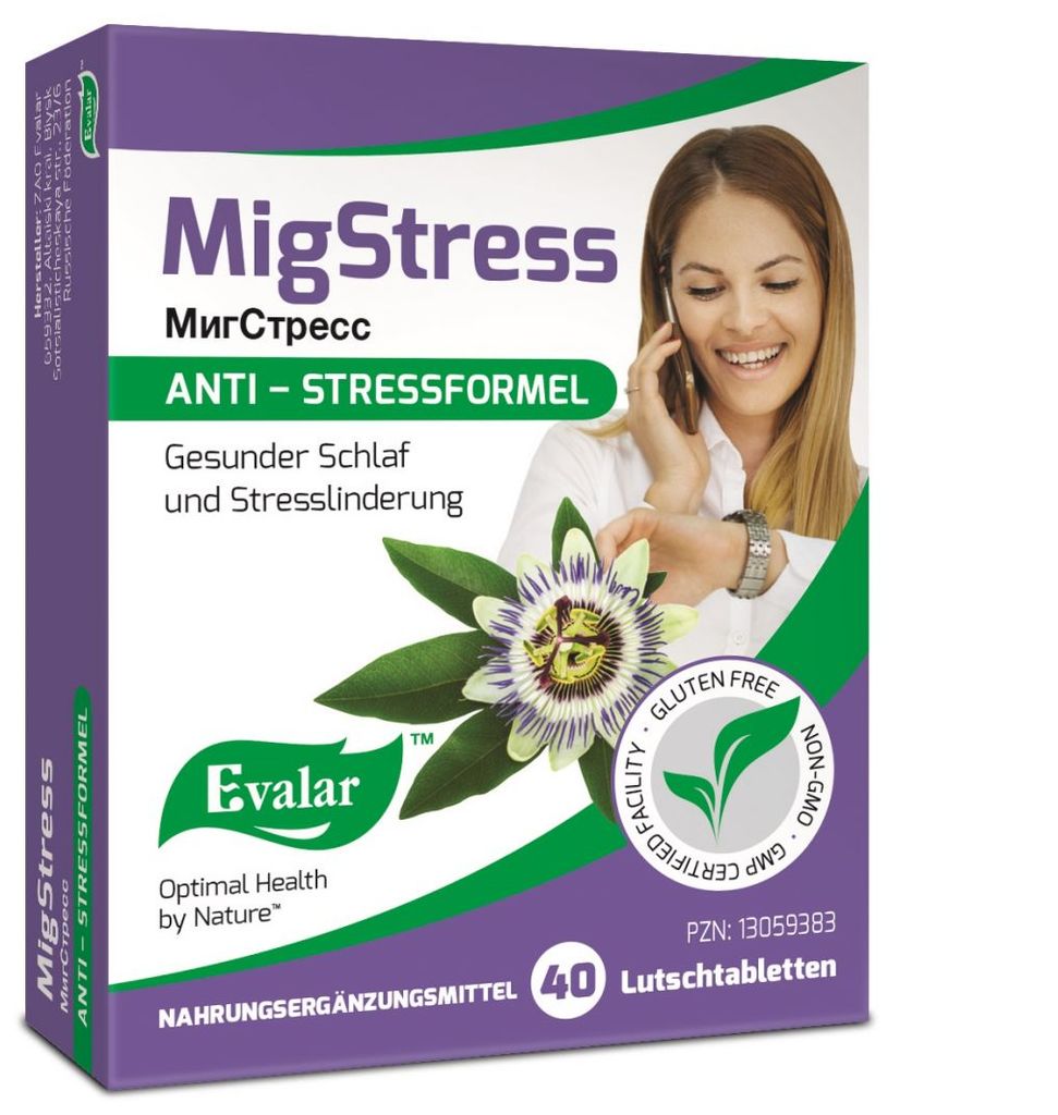 Experten warnen davor, die Gefahr von Stress zu unterschätzen. Stress belastet den Körper von innen, raubt Kräfte. Das Ergebnis: Angst kann sich bis zur Paranoia entwickeln, leichte Reizbarkeit, oft auch gesteigerte Aggression, wodurch sich die körpereigene Abwehr reduziert. Deshalb ist es wichtig, bereits erste Anzeichen von Stress so schnell wie möglich zu erkennen. MigStress kombiniert bewährte Komponenten – Passionsblumenextrakt, Glycin und Schwarzbohnensamen - für diese finden sich sogar wissenschaftliche Hinweise zur Verbesserung der Gehirnaktivität. Zur Einnahme von MigStress Lutschtabletten braucht man zudem kein Wasser, MigStress kann einfach überall hin mitgenommen werden.