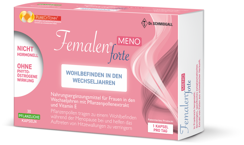 Femalen® forte MENO ist ein natürliches und hormonfreies Nahrungsergänzungsmittel mit dem patentierten Pollenextrakt PureCyTonin® und Vitamin E, das speziell für Frauen in den Wechseljahren entwickelt wurde. Es lindert sowohl körperliche als auch emotionale Beschwerden, die in dieser Lebensphase häufig auftreten, und verbessert so das allgemeine Wohlbefinden. Der enthaltene einzigartige Pflanzenpollenextrakt trägt zur Linderung typischer Wechseljahresbeschwerden wie Hitzewallungen, Stimmungsschwankungen, Nervosität, Schlafprobleme oder Müdigkeit bei.