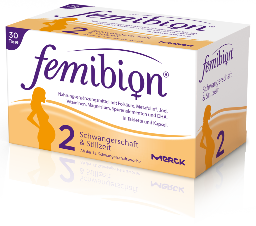 Femibion® 2 ist ein Nahrungsergänzungsmittel und enthält 800 μg Folat (400 μg Folsäure und 416 μg Metafolin®), zudem 11 weitere wertvolle Vitamine, Magnesium, 5 Spurenelemente und DHA um den erhöhten Bedarf zu decken.