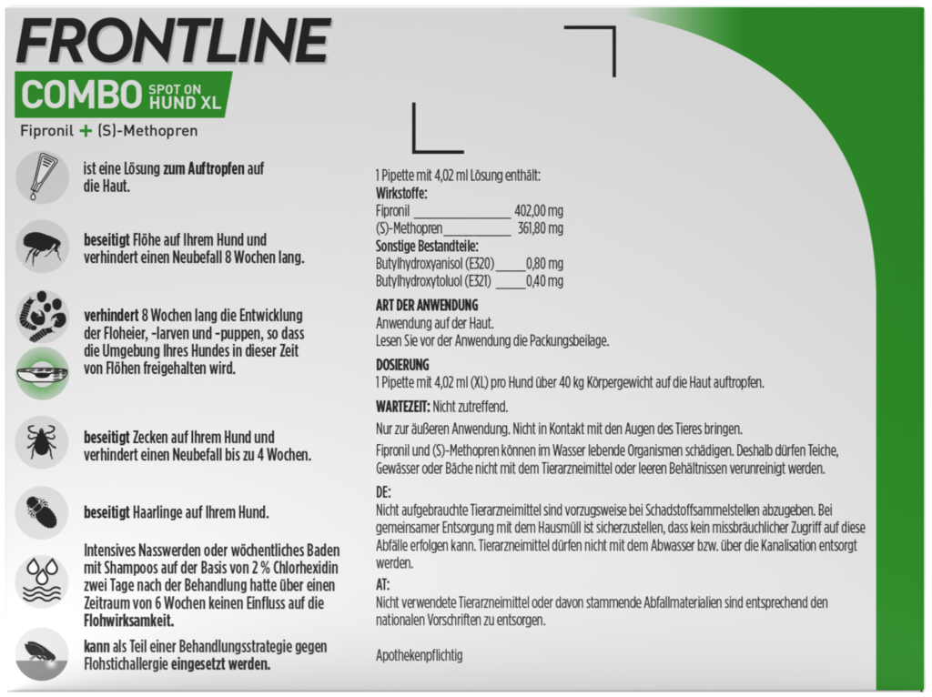 Die Wirkung von FRONTLINE COMBO® basiert auf der Kombination der Wirkstoffe Fipronil und (S)-Methopren. Nach dem Auftragen verteilt sich der Wirkstoff innerhalb von 1-2 Tagen über die oberen Hautschichten des Tieres. Der Wirkstoff wird in den Talgdrüsen gespeichert und kontinuierlich mit dem Talg ins Fell und auf die Haut des Hundes abgegeben. Fipronil stört die Reizleitung von Insekten (Flöhe und Haarlinge) und Spinnentieren (Zecken), so dass die Parasiten absterben. Der Wirkstoff wirkt bei Wirbellosen, aber nicht bei Säugetieren wie Katzen, Hunden oder auch dem Menschen. (S)-Methopren ist ein Wachstumsregulator für Insekten (IGR), der die Entwicklung der unreifen Stadien der Insekten hemmt. (S)-Methopren durchdringt die Eischale frisch gelegter Floheier oder wird durch die Kutikula der adulten Flöhe aufgenommen. Zusätzlich wird die Entwicklung von Larven und Puppen gestört, so dass die Umgebung des behandelten Tieres von diesen Stadien freigehalten werden kann. Für eine optimale Verteilung sollten die Tiere 48 Stunden vor und nach der Behandlung nicht gebadet werden.