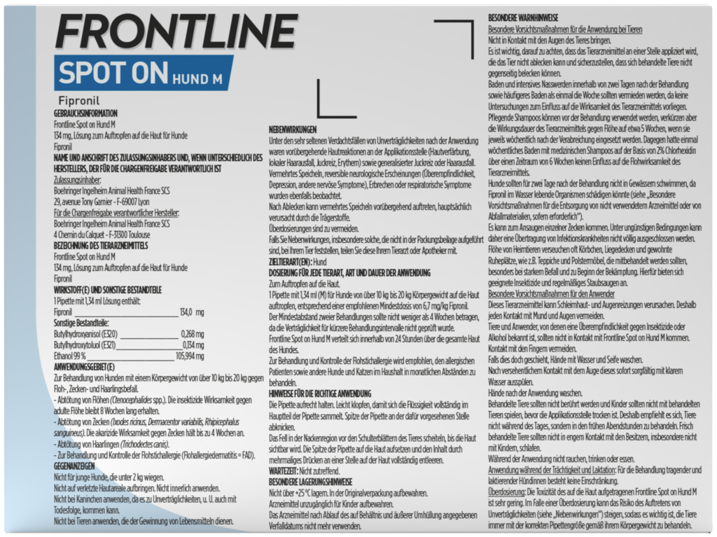 Viele zufriedene Anwender sprechen für den Erfolg des Produktes. Frontline® wirkt hochselektiv im Parasiten und ist bei richtiger Anwendung unkritisch für Hund und Mensch.