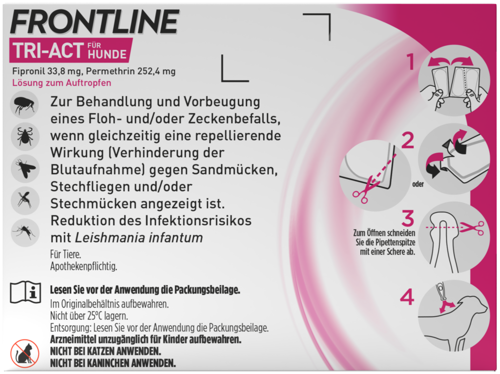 FRONTLINE TRI-ACT® - der innovative Parasitenschutz schützt Hunde gegen Zecken, Flöhe und fliegende Parasiten (Stechmücken, Sandmücken und Stechfliegen) schon vor dem Stich durch seine abwehrende Wirkung. So wird das Risiko der Übertragung gefährlicher Krankheiten reduziert.