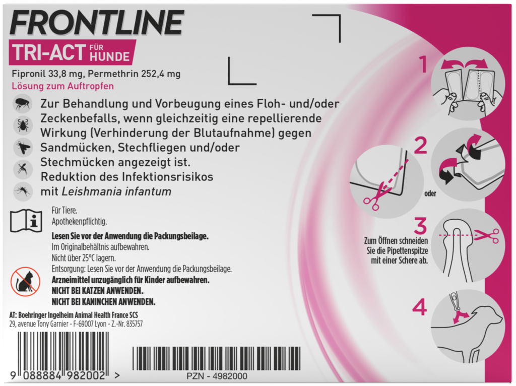 - Einfach anzuwenden: Die vordosierte Pipette, je nach Gewicht des Hundes, macht die Anwendung denkbar einfach