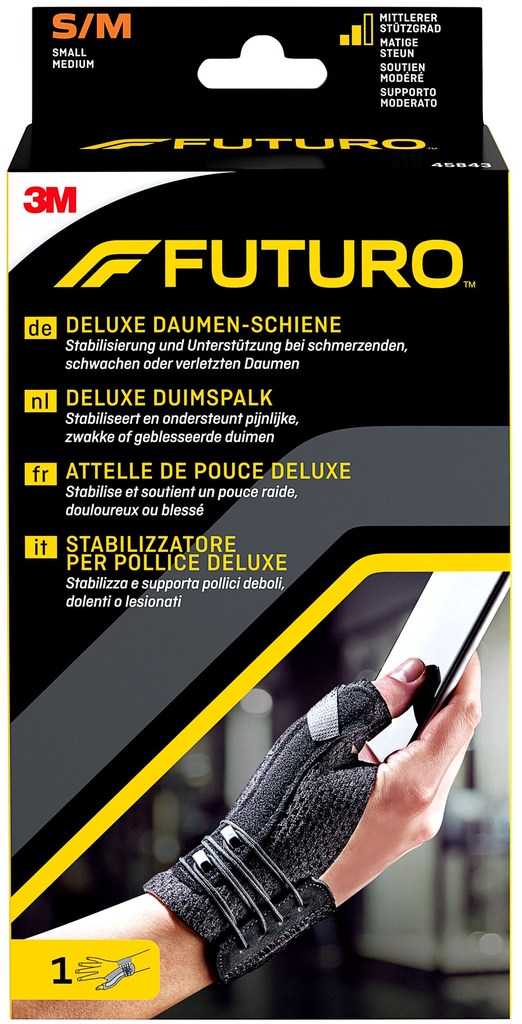 Die FUTURO™ Deluxe Daumen-Schiene stützt Ihren Daumen, sodass Sie sich auf die Aufgabe Ihrer Hand konzentrieren können – egal ob Texten, Spielen oder Gartenarbeit. Diese Daumen-Schiene verfügt über zwei Stützelemente und passt sich an Ihre Hand an. Ein schmerzender Daumen lässt Sie kaum an etwas anderes denken – hier hilft die FUTURO™ Deluxe Daumen-Schiene.