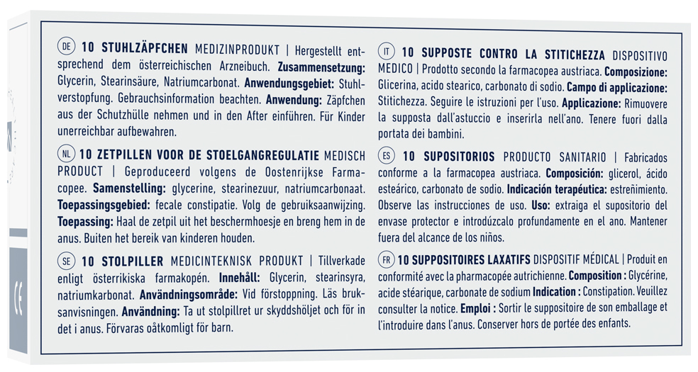 Das Zäpfchen wird sanft in den After eingeführt. Falls nicht anders verordnet am besten morgens kurz vor dem Aufstehen einführen. Nach Einführen des Zäpfchens sollte man die Entleerung etwas hinhalten, damit eine ausreichende Erweichung der verhärteten Stuhlmassen stattfinden kann.