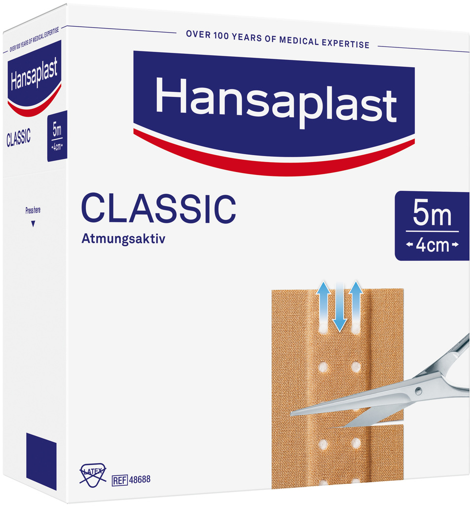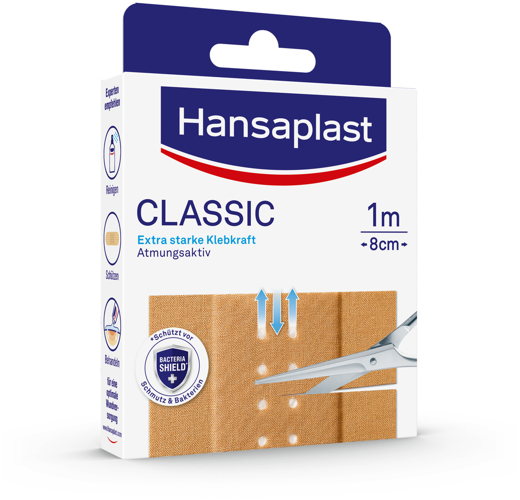 Das Hansaplast Classic Pflaster erhalten Sie als praktische Meterware – so können Sie sich die benötigte Größe einfach mit einer Schere individuell zuschneiden.