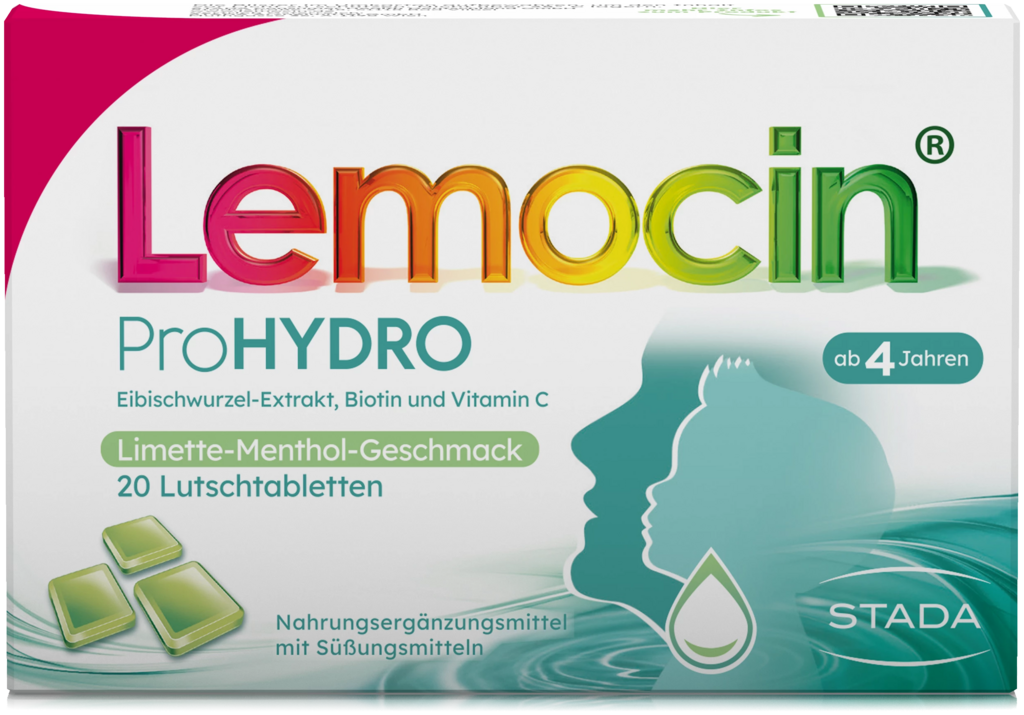 Lemocin® ProHYDRO Lutschtabletten befeuchten Hals und Rachen dank der speziell aufeinander abgestimmten Rezeptur aus natürlichem Eibischwurzel-Extrakt, Biotin und Vitamin C. Lemocin® ProHYDRO ist ein Nahrungsergänzungsmittel und enthält die Süßungsmittel Sorbit und Erythrit. Biotin trägt zu einer normalen Funktion der Schleimhäute bei. Vitamin C trägt zu einer normalen Funktion des Immunsystems bei.