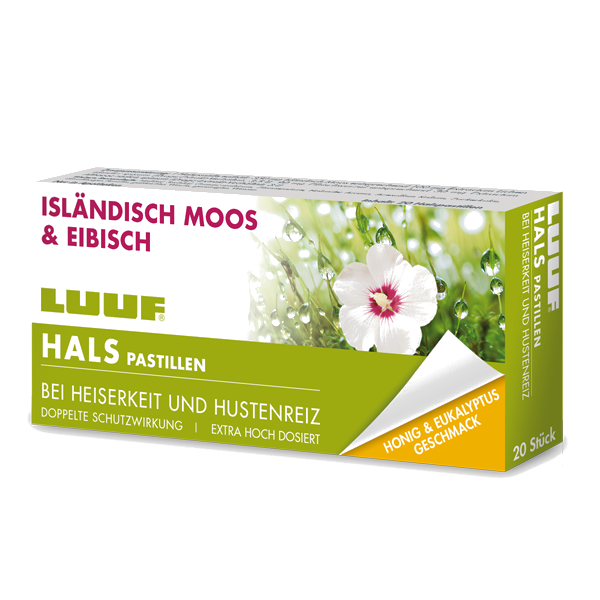 LUUF® Halspastillen mit Isländisch Moos und Eibisch fördern zusätzlich eine schnellere Erholung und Regeneration der angegriffenen Schleimhaut. Darüber hinaus wird auch der Entstehung von Husten vorgebeugt.