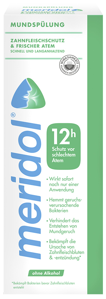 meridol® SICHERER ATEM Mundspülung bekämpft mit seinem 3-fach Wirkmechanismus geruchsaktive Bakterien auf der Zunge und in der gesamten Mundhöhle. Das Ergebnis ist ein langanhaltend frisches Mundgefühl. Das natürliche Gleichgewicht der Mundflora bleibt erhalten. Die hohe Wirksamkeit ist klinisch geprüft. Das enthaltene Aminfluorid (250 ppm Fluorid) schützt außerdem wirksam vor Karies. meridol® SICHERER ATEM Mundspülung enthält keinen Alkohol.