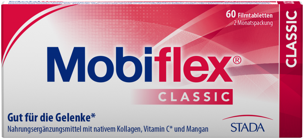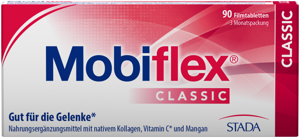 Gesunde Gelenke sind die Voraussetzung für unsere Beweglichkeit. Mobiflex® Classic Filmtabletten mit Mangan, Vitamin C und nativem Kollagen Typ II helfen, Knorpel und Bindegewebe mit allen wichtigen Nährstoffen zu versorgen.
