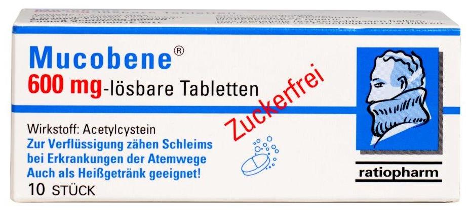 Mucobene 600 mg-lösbare Tabletten eignen sich als Zusatztherapie zusammen mit reichlich Flüssigkeit, zur Schleimlösung und zum erleichterten Abhusten bei Atemwegserkrankungen (Lunge und Bronchien).
