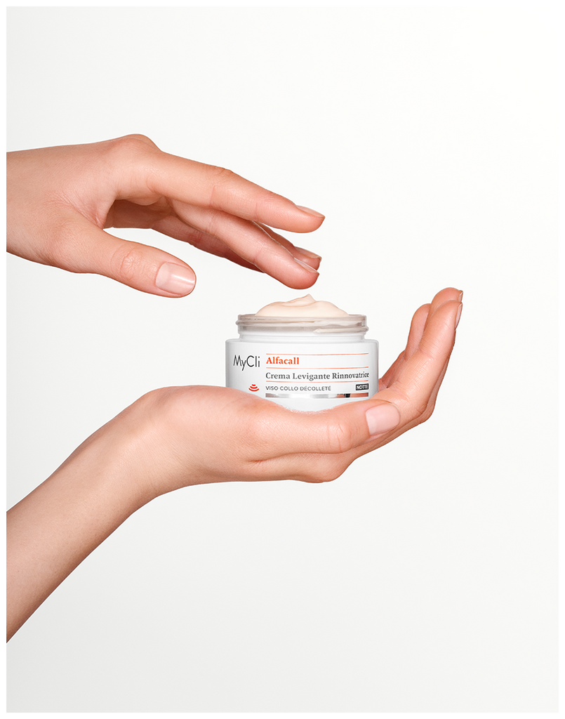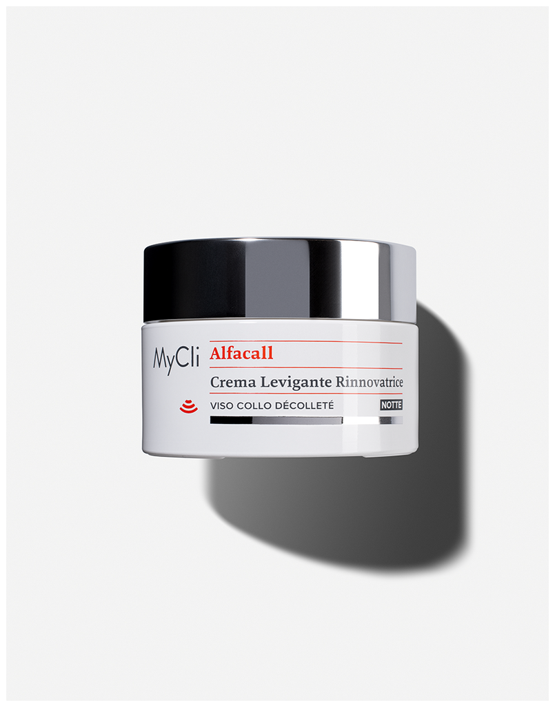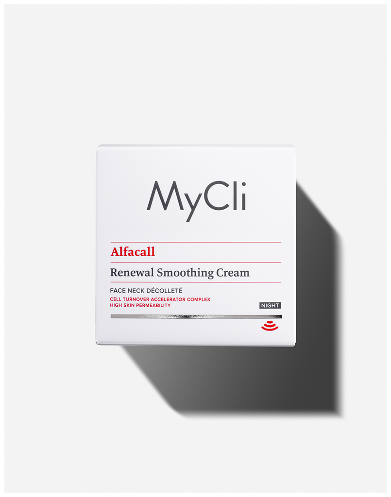 MyCli Alfacall Glättende Erneuerungscreme – Nachtpflege ist eine Öl-in-Wasser-Emulsion mit hohem Gehalt an Alpha-Hydroxysäure. Die Formel vereint einen Komplex aus drei Säuren – Glycol-, Brenztrauben- und Lactobionsäure – und eine Bündelung von Molekülen der neuesten Generation, die eine starke exfolierende, den Hauterneuerungsprozess anregende Wirkung hat, die dem Feuchtigkeitsverlust der Haut entgegenwirkt.