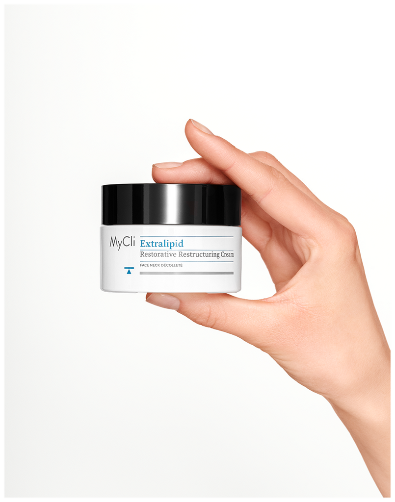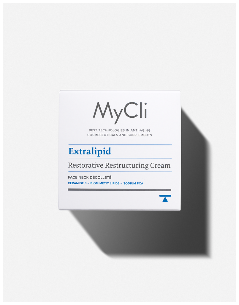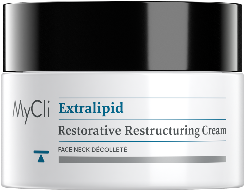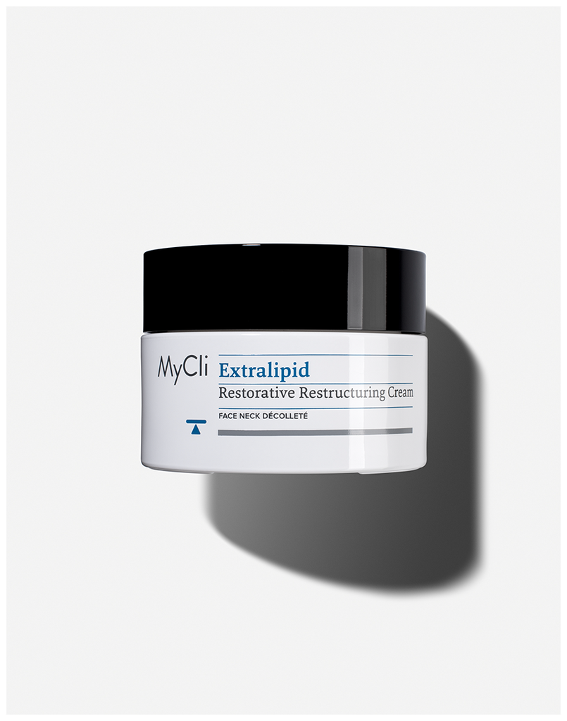 MyCli Extralipid Creme ist eine Aufbaubehandlung der Hautbarriere mit rückfettender und festigender Wirkung. Die Formel des Produkts bringt die endogene Produktion von Hautlipiden in Gang und schenkt trockener, sehr trockener oder gestresster Haut oder Haut, die nach professionellen Hautverjüngungsbehandlungen eine Reparatur- oder Pflegehandlung benötigt, dauerhafte Durchfeuchtung, tiefenwirksame Versorgung mit Nährstoffen und Wohlbefinden. Die Formeltechnologie auf Basis von Ceramid 3, biomimetischen Lipiden, Cholesterin, Allantoin, Natrium PCA und Palmitamid MEA unterstützt den Wiederaufbau der Epidermis. Die Haut wird kompakt, weich und elastisch.