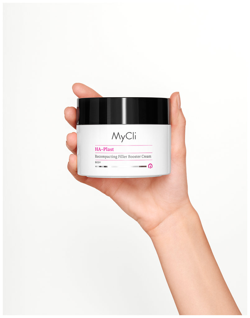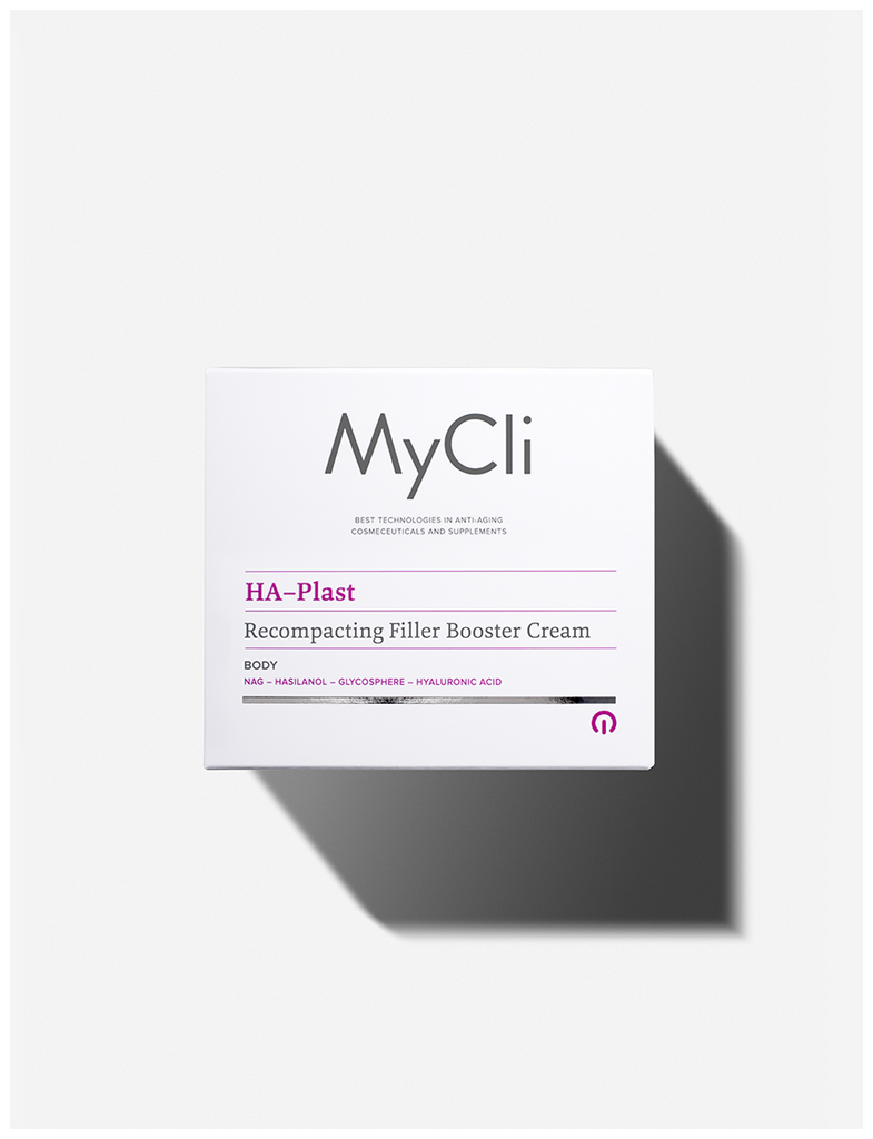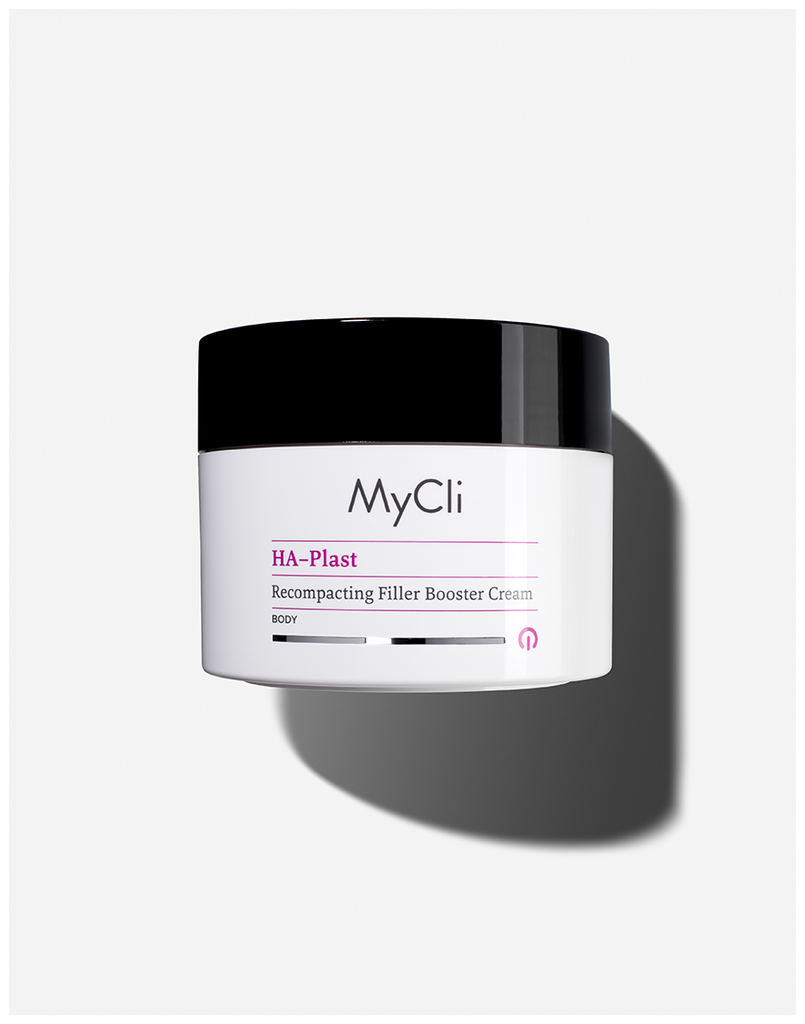 MyCli HA-Plast Festigende Filler-Booster-Körpercreme ist eine kompakte Emulsion speziell für den Körper mit ultrakorrektivem Soforteffekt. Ihre Formel regt die Produktion von endogener Hyaluronsäure an, verleiht der Haut Stützkraft und Plastizität und begünstigt das Auffüllen von oberflächlichen Mikrofalten. Zudem verstärkt sie die Aktivität der Fibroblasten und erhöht die Durchfeuchtung der oberen Hautschicht. Für eine feste, weiche und fühlbar seidige Haut. Integrierte mikromolekulare Technologie auf Basis von: NAG, Glykogen und spezialisiertem Silanol.