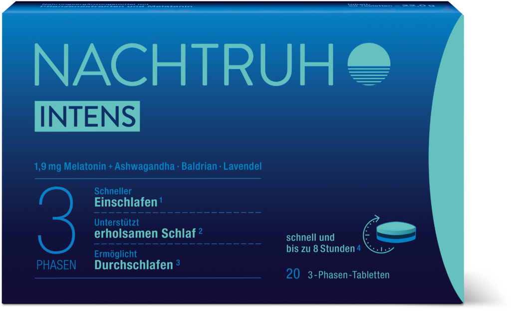 NACHTRUH INTENS ist eine 3-Phasen-Tablette zur Unterstützung bei Schlafproblemen. Das Nahrungsergänzungsmittel enthält eine Kombination aus 1,9 mg Melatonin und den ausgewählten pflanzlichen Extrakten Baldrian, Lavendel und Ashwagandha. Besonders ist, dass die Inhaltsstoffe dank der 3-Phasen-Technologie nach Einnahme der Tablette nicht alle sofort, sondern zeitlich versetzt während der Nacht freigesetzt werden. Die Freisetzung beginnt schnell und hält bis zu 8 Stunden an.