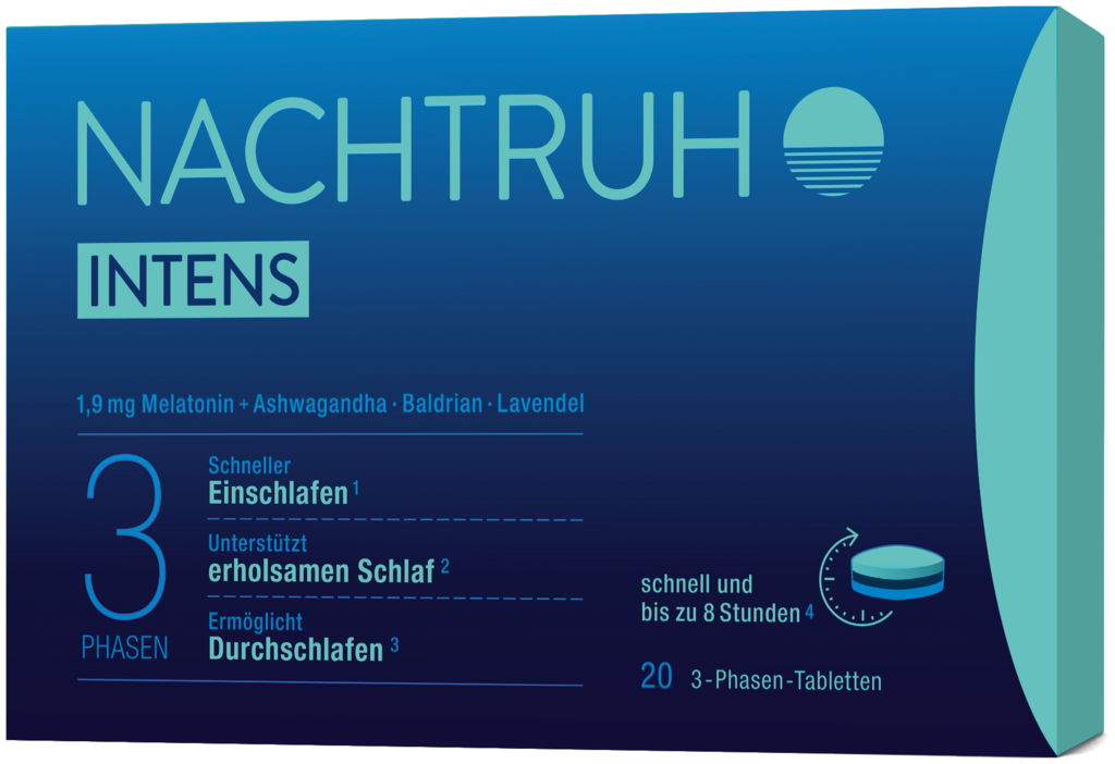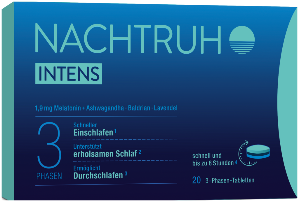Für Alle, die sich eine Unterstützung beim Ein- und Durchschlafen wünschen, wurde NACHTRUH INTENS entwickelt. NACHTRUH INTENS kombiniert auf neue und einzigartige Weise 1,9 mg Melatonin und die pflanzlichen Extrakte aus Baldrian, Lavendel und Ashwagandha. Dabei nutzt NACHTRUH INTENS die bereits bewährte 3-Phasen-Technologie von NACHTRUH, welche die Inhaltsstoffe nach Einnahme nicht alle sofort, sondern zeitlich versetzt während der Nacht freigibt.