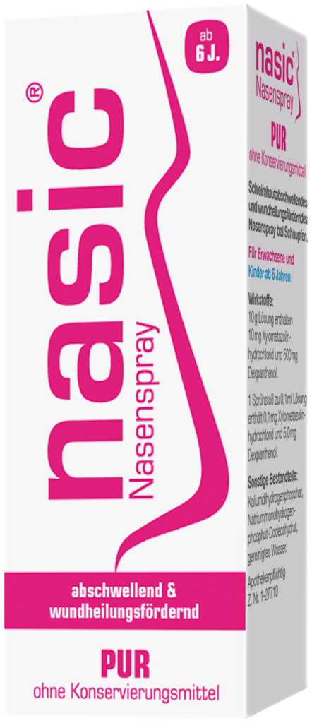 nasic pur Nasenspray wird zur Abschwellung der Nasenschleimhaut bei Schnupfen und zur unterstützenden Behandlung der Heilung von Haut- und Schleimhautläsionen, anfallsweise auftretendem Fließschnupfen (Rhinitis vasomotorica) und zur Behandlung von Nasenatmungsbehinderung nach operativen Eingriffen an der Nase angewendet. nasic pur Nasenspray ist für Erwachsene und Kinder ab 6 Jahren bestimmt. Wenn Sie sich nach 7 Tagen nicht besser oder gar schlechter fühlen, wenden Sie sich an Ihren Arzt.