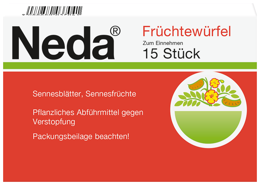 Neda-Früchtewürfel sind ein pflanzliches Arzneimittel zur kurzfristigen Anwendung bei gelegentlich auftretender Verstopfung (Obstipation). Die Wirkstoffe, Sennesblätter und Sennesfrüchte, regen die Tätigkeit des Dickdarms an, wobei die Wirkung nach 8-12 Stunden eintritt. Die Verdauung und die Aufnahme der Nahrungsbestandteile in den Körper bleiben unbeeinflusst. Neben der Anregung der Darmtätigkeit führen Neda-Früchtewürfel auch zu einer Erhöhung des Wassergehaltes im Darminhalt.