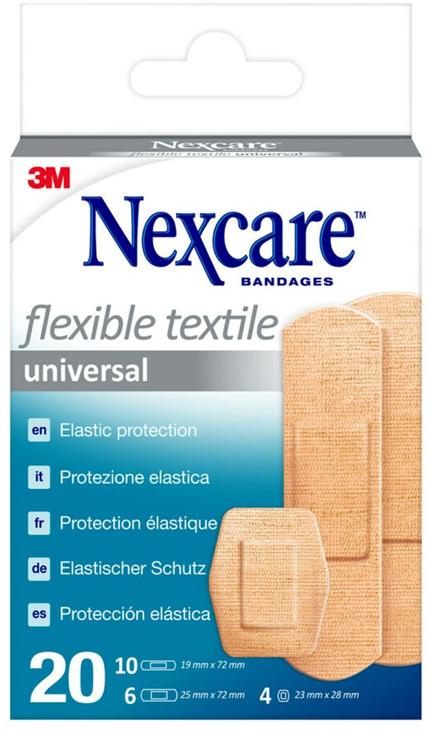Nexcare™ Flexible Textile Universal Pflaster schützen kleinere Wunden vor Verunreinigungen. Sie bestehen aus dehnbarem Material, das sich Ihren Bewegungen entsprechend anpasst. Gute Haftung auf der Haut. Eine Packung enthält 20 Pflaster: 10 Stück - 19 mm x 72 mm, 6 Stück - 25 mm x 72 mm, 4 Stück - 22.5 mm.