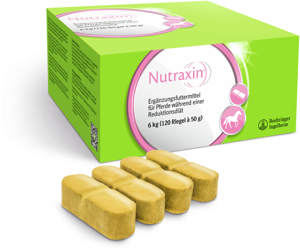 Nutraxin® ist der erste speziell für Pferde mit EMS entwickelte Riegel. Das „Nutraceutical“ versorgt die Pferde mit Vitaminen, Mineralstoffen, Spurenelementen und Aminosäuren, die in einer Reduktionsdiät nur unzureichend enthalten sind und gleicht den Mangel an diesen Nährstoffen aus.
