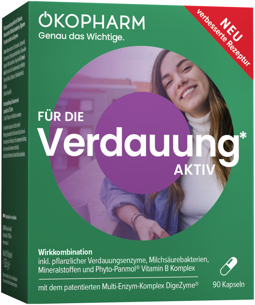 Die optimal abgestimmte Rezeptur der ÖKOPHARM® Für die Verdauung* Aktiv Kapseln mit pflanzlichen Verdauungsenzymen, Milchsäurebakterien und ausgewählten Mikronährstoffen fördert eine effiziente Verdauungs- und Darmaktivität.
