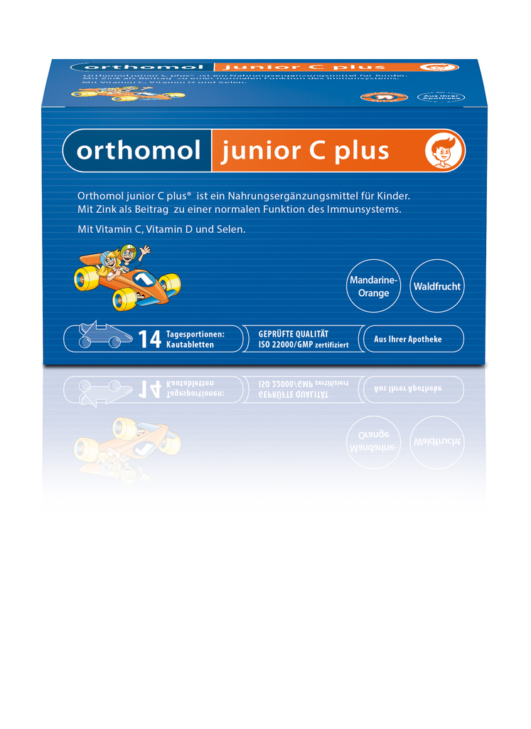 Orthomol junior C plus ist ein Nahrungsergänzungsmittel für Kinder. Mit Vitamin D als Beitrag zu einer normalen Funktion des Immunsystems bei Kindern. Mit Vitamin C, Selen und Zink.