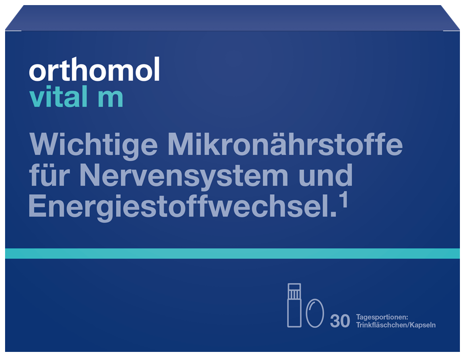 Orthomol Vital m ist ein Nahrungsergänzungsmittel. Wichtige Mikronährstoffe, wie B-Vitamine und Magnesium, tragen zu einem normalen Energiestoffwechsel und zu einer normalen Funktion des Nervensystems bei. Mit Omega-3-Fettsäuren.